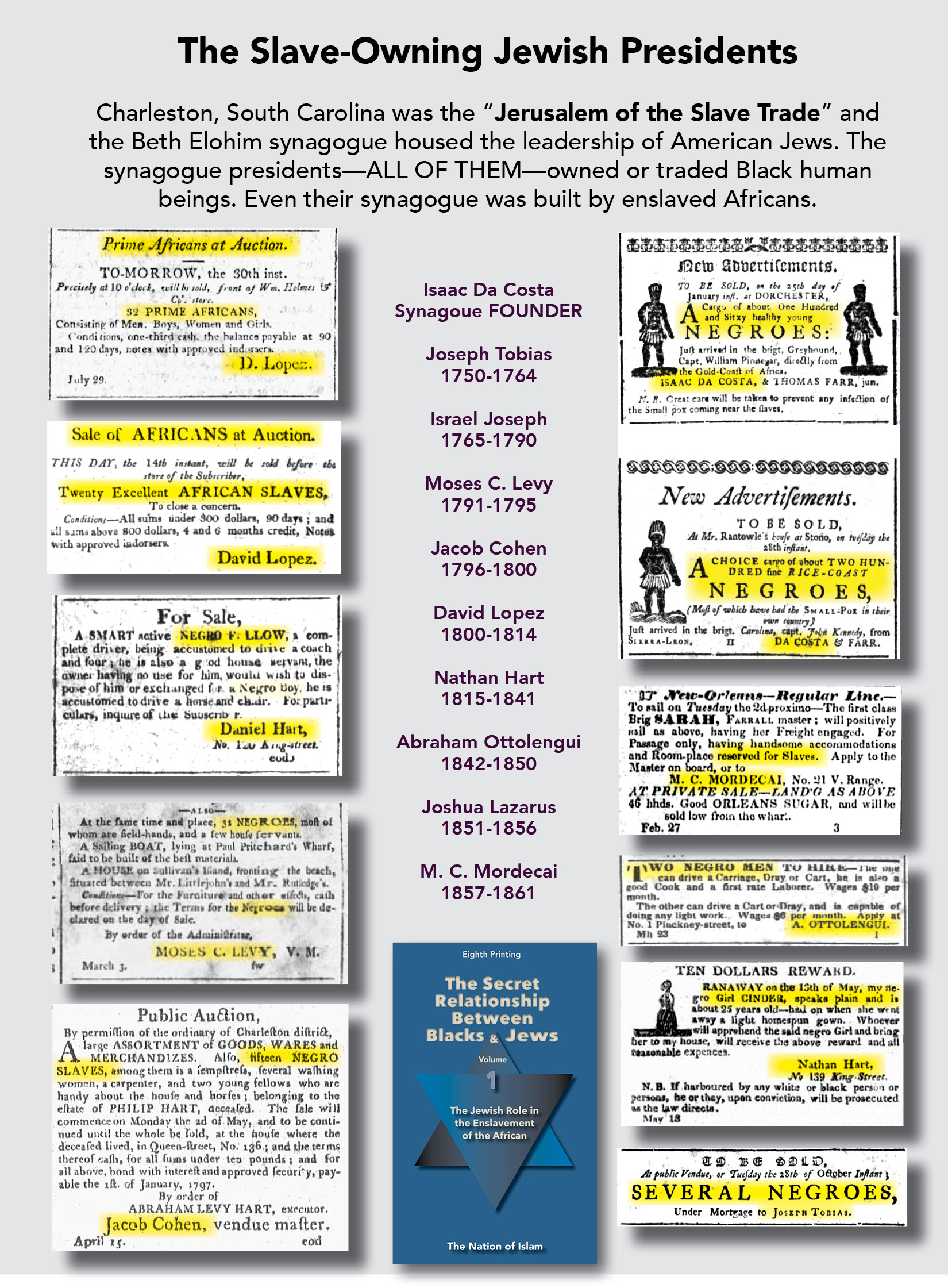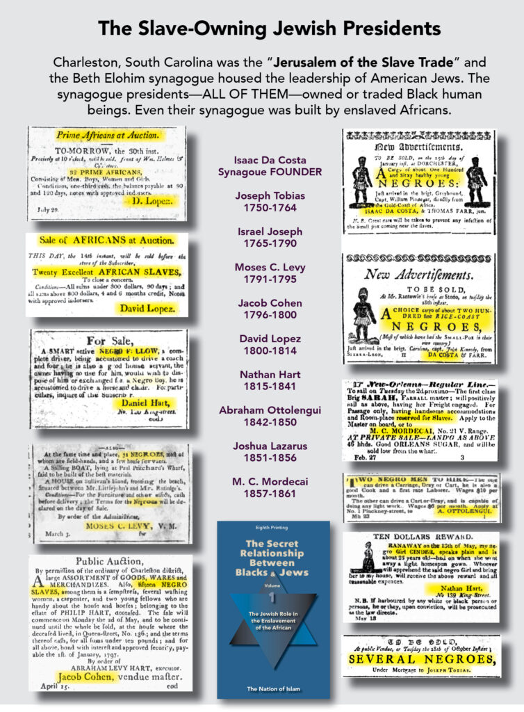 The fact is Charleston’s SYNAGOGUE PRESIDENTS and the majority of America’s Jewish elites were dedicated to the endless enslavement of Black people. And this behavior can be easily found in every major center of Jewish settlement—Richmond, New Orleans, Newport, Philadelphia, New York and everywhere else. No longer can it be said that Jewish slave traders were marginal members of a rejected underclass. The top leadership of Charleston’s Jewish institutions—every last one of them—owned slaves and made their livings from Black slavery. Yet, the city’s slaveholding Rabbi Gustavus Poznanski referred to it in a way that is unique in the annals of this forever wandering people: “This [Charleston] synagogue is our temple, this city our Jerusalem, this happy land our Palestine…”